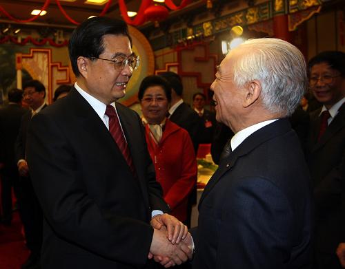 1月1日,中国人民政治协商会议全国委员会在北京举行新年茶话会。中共中央总书记、国家主席、中央军委主席胡锦涛在茶话会上同与会人士亲切交谈。新华社记者 刘卫兵 摄